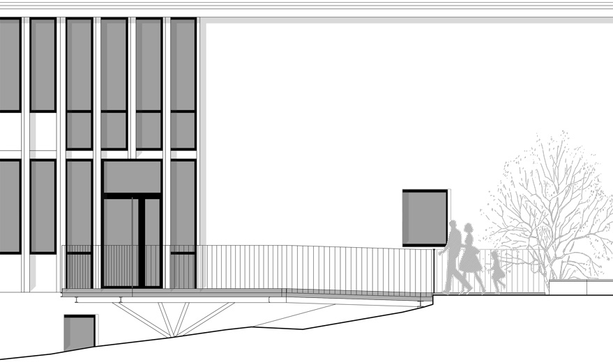Der Gitterroststeg wird in Flucht der Innenwände der Pausenhalle in das Freie fortgeführt und bildet dort eine eigene fast quadratische Plattform. An dieser Plattform beginnt der eigentliche Steg, welcher mit dem anderen Ende seitlich am neuen Allwetterplatz andockt. Dort wird als Knotenpunkt eine kleine Aufenthaltsfläche mit Sitzbänken zum Spielfeld orientiert errichtet. Um den vorhanden Höhenversprung zwischen Allwetterplatz und Pausenhalle Bestandsgebäude auszugleichen, wird der Steg als behindertengerechte Rampe ausgebildet. Die Last der Gitterrostplattform wird über 4 schräge Stahlstützen auf eine zentrale Stahlbeton-Fundamentplatte punktförmig abgetragen.