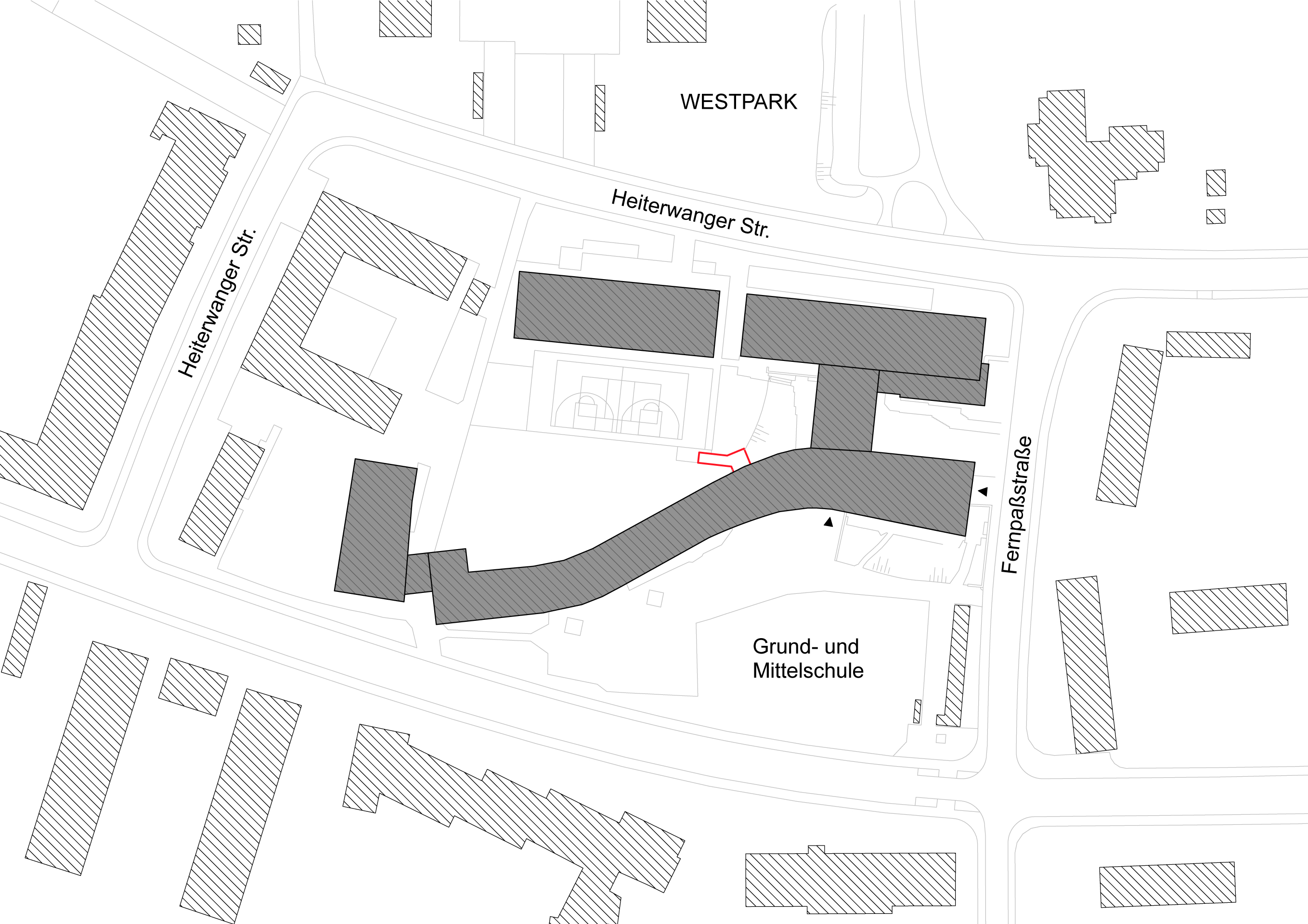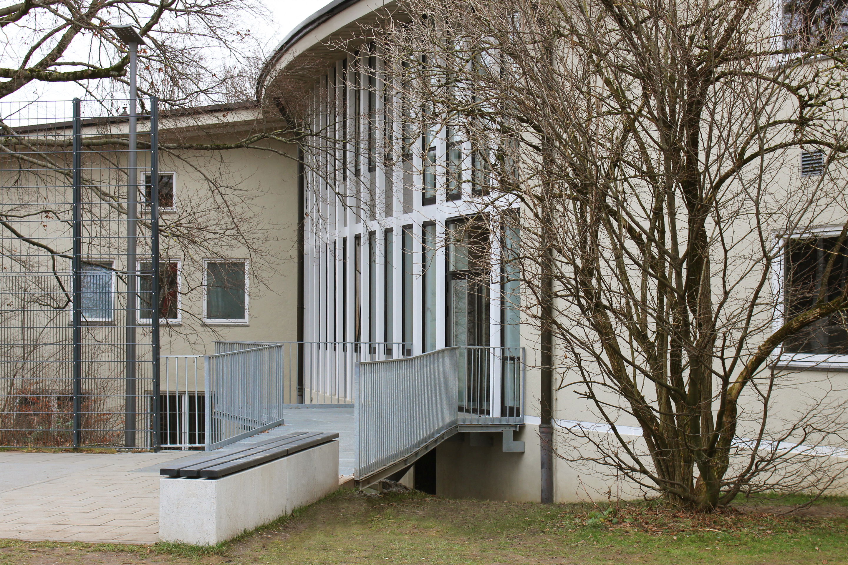 In der Städtischen Grund- und Mittelschule Fernpaßstraße 41 in München erfolgte als Maßnahme im Bestand der Einbau einer Aussentür mit Steg im Erdgeschoß zur Verbindung Bestandsgebäude Mittelschule und Pavillon über das neu errichtete Spielfeld. Es waren Belange des Denkmalschutzes zu berücksichtigen.