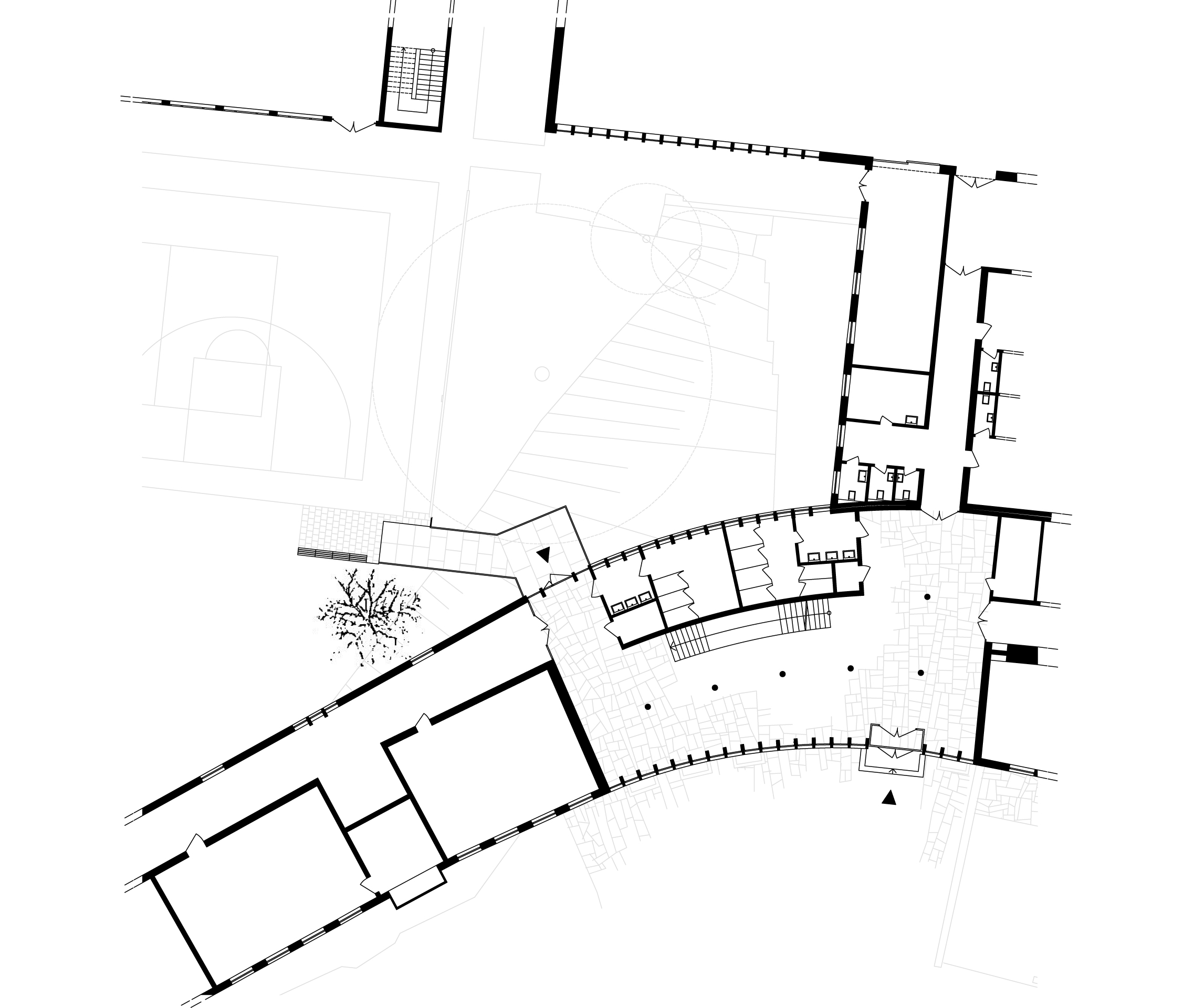 Der neu errichtete Pavillon wurde über einen neuen offenen Gitteroststeg und eine neue Türöffnung mit der Pausenhalle des Bestandsgebäude in der Mittelschule verbunden. Es kam eine einfache Stahlkonstruktion mit offenen Stahlprofilen zur Ausführung. Das beidseitige vertikale Geländer des Steges besteht aus massiven Rundstäben mit aufgesetztem Flachstahlhandlauf und greift damit in der Formensprache die einfachen Stabgeländer des denkmalgeschützten Bestandsgebäudes auf.